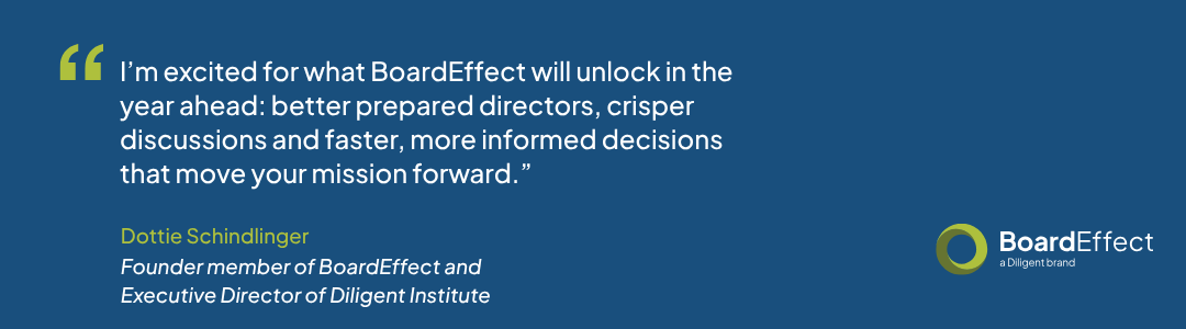 I’m excited for what BoardEffect will unlock in the year ahead: better prepared directors, crisper discussions and faster, more informed decisions that move your mission forward. That’s why we built BoardEffect in the first place, and it’s why I’m as energized now as I was on day one.