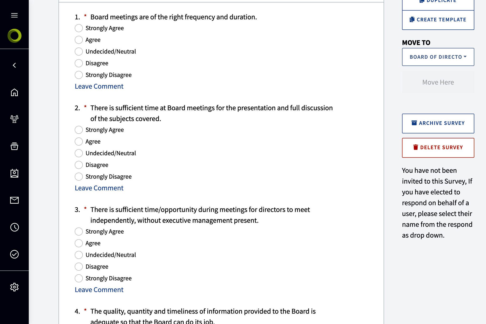 “The survey feature for board evaluations has streamlined decision-making processes and improved participation.” — Liz Thompson, Executive Assistant to the President & Corporate Secretary, Presbyterian SeniorCare Network