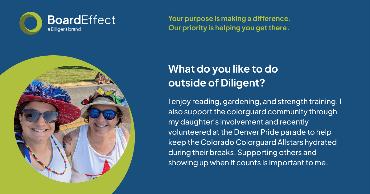 Congratulations to Pia for being our very first BoardEffect People of Purpose feature. Her compassion, expertise, and commitment to client success continue to drive meaningful impact for both our clients and team. Stay tuned as we celebrate more outstanding individuals shaping the Diligent experience.