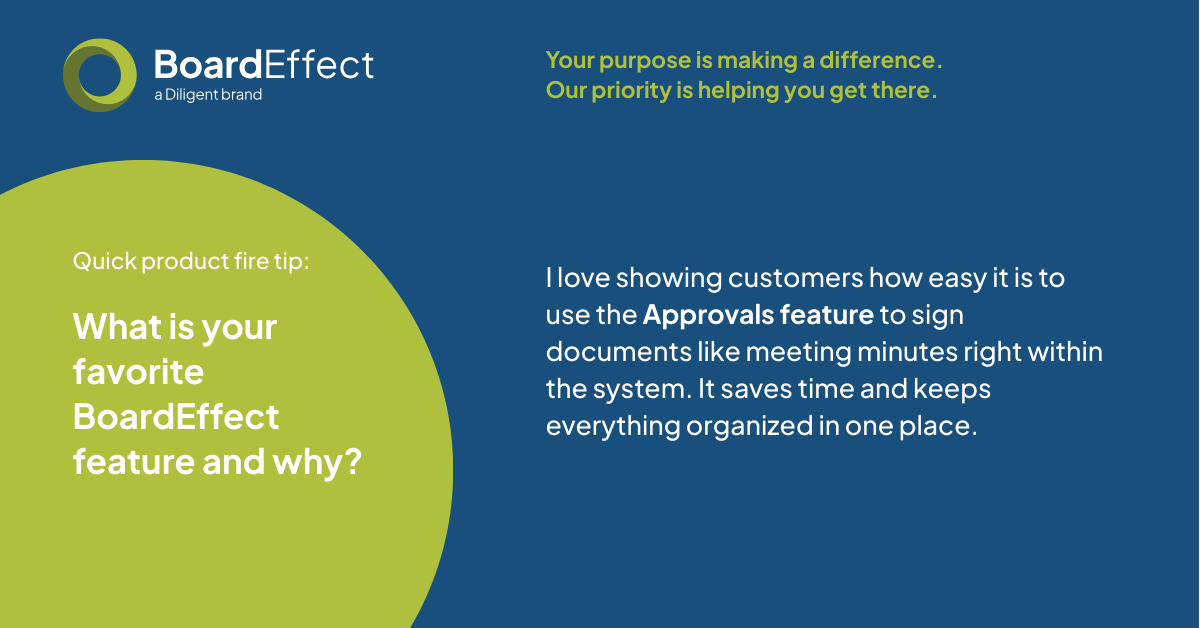 Karen’s go-to feature in BoardEffect is Approvals. It allows board and committee members to sign documents directly in the platform, which makes things like signing meeting minutes fast and simple - no extra emails, no paper trails.