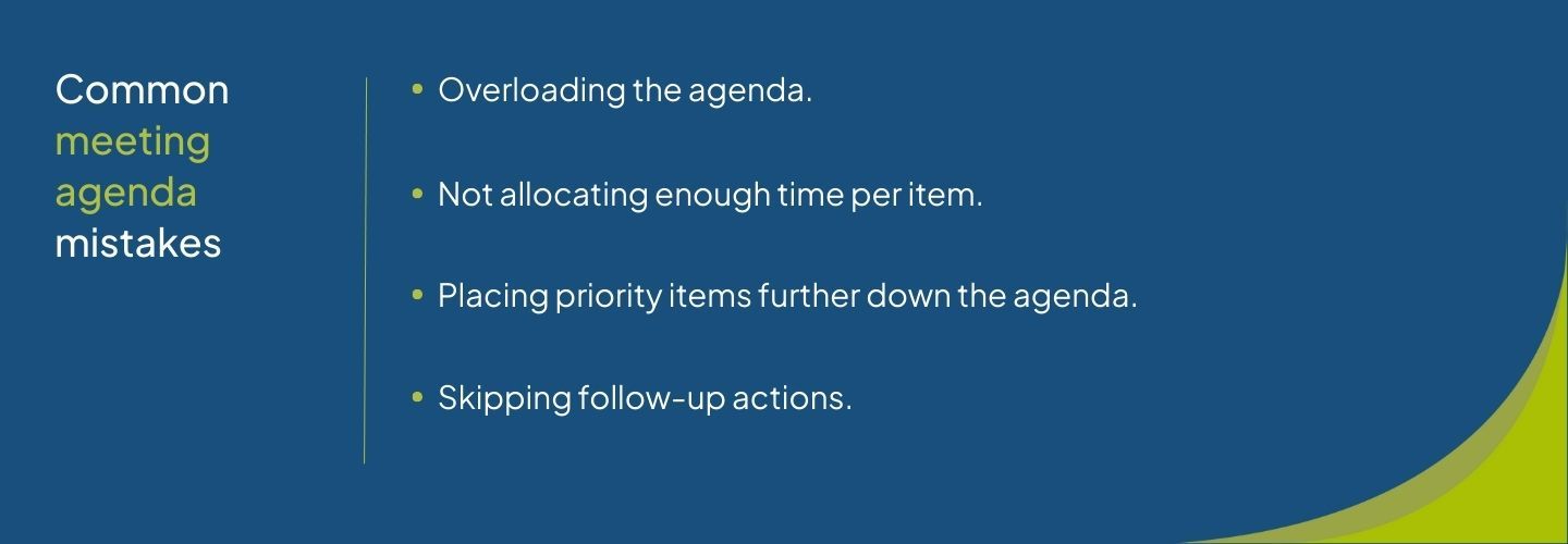 Poorly structured agendas can do as much harm as having no agenda. The following are mistakes to avoid in agenda creation:
