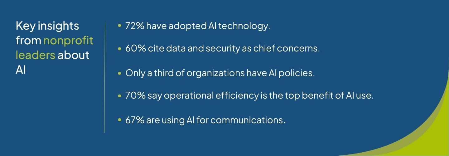 Nonprofits have taken significant steps to adopt AI, and it’s no wonder given that exploration can be low-cost for mission-driven organizations. For those still on the fence, consider AI tools built-in to your technology partners’ solutions as low-risk ways to test the waters with AI capabilities.